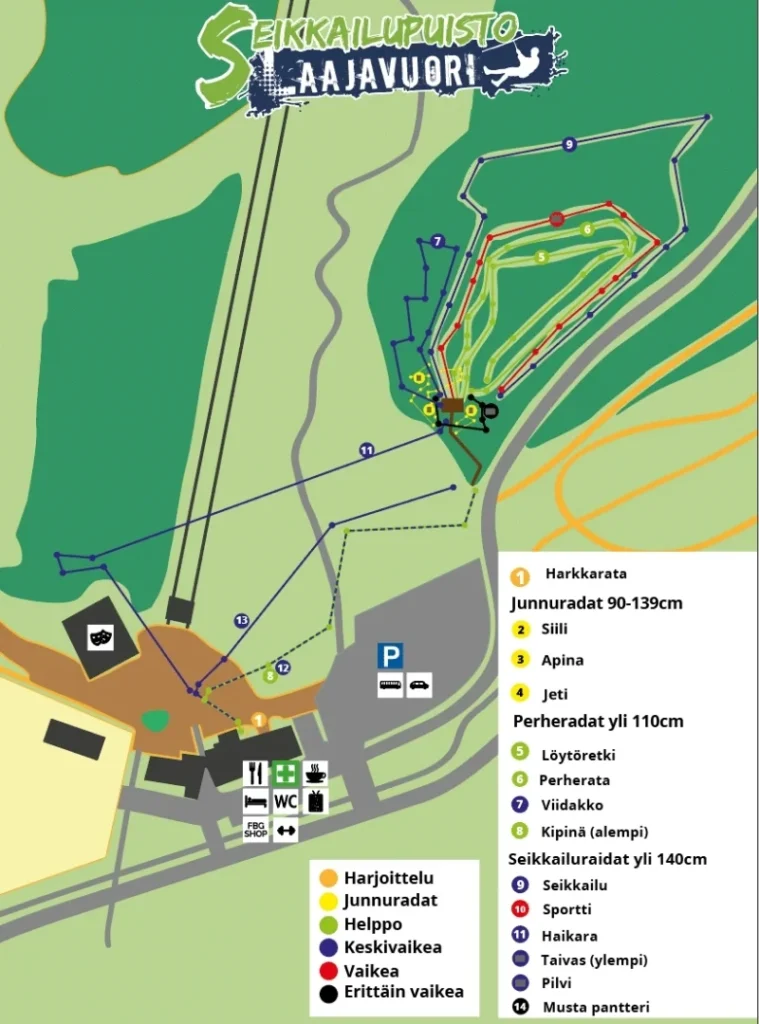 Väriselitykset: Keltainen = Junnuradat, Vihreä = Helppo, Sininen = Keskivaikea, Punainen = Vaikea, Musta = Erittäin vaikea